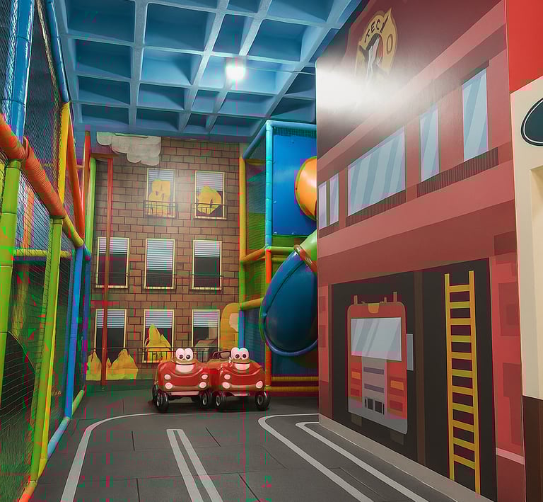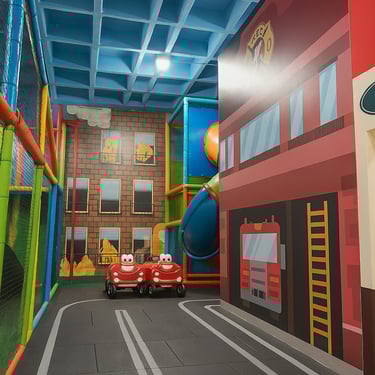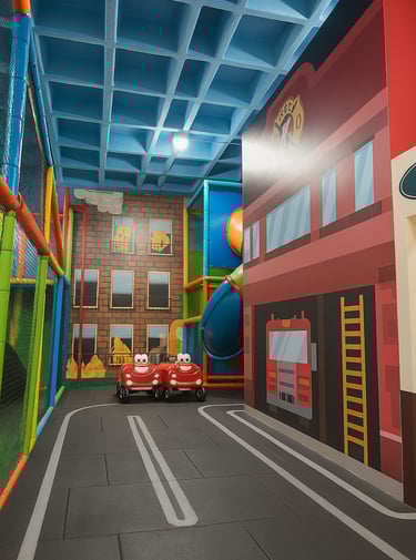 Un lugar para los festejos infantiles ideal. A manera de Kidzania, el salón está ambientado con varios juegos y actividades para los niños. Una casa con cocina, zona de rapel, carretera, estación de policía, tirolesa, bomberos, alberca de pelotas... ¡Hasta videojuegos!